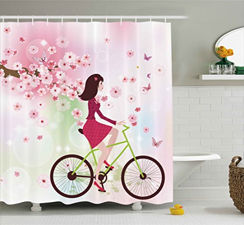 Pink Decor Shower Curtain by Ambesonne, Modern Girl Riding Vintage Retro Bike Lilies Flowers Image, Fabric Bathroom Decor Set with Hooks, 84 Inches Extra Long, Pink Light Pink and Lime Green