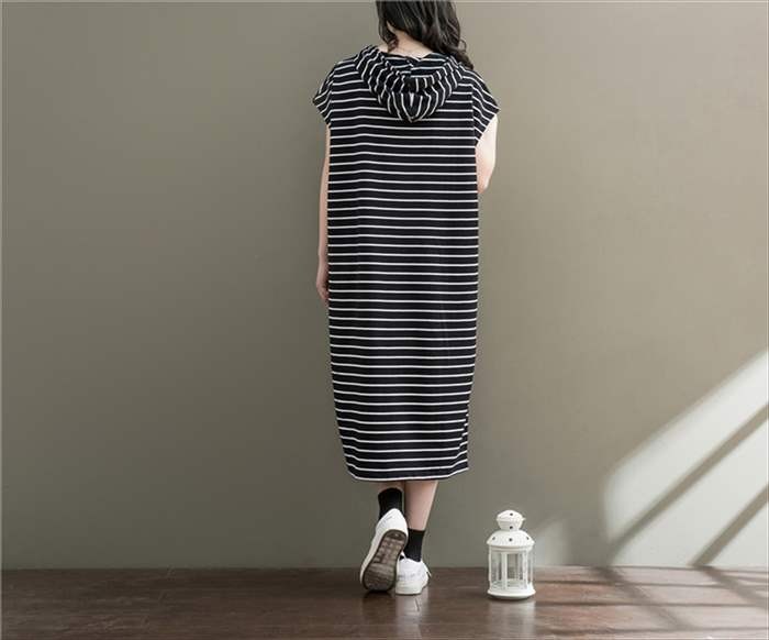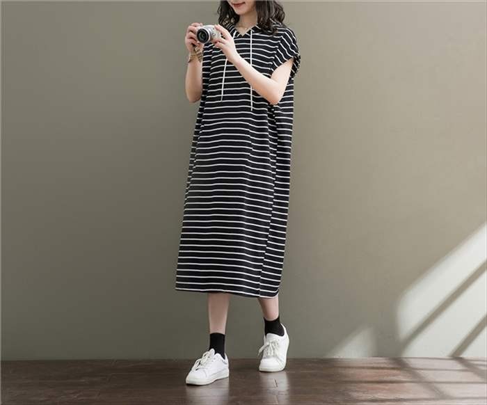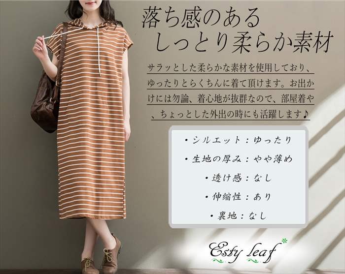 ・フレンチスリーブが可愛くてお洒落なフード付きカットワンピース。・落ち感のある、ポリエステル混のサラッとした柔らかな素材を使用しており、ゆったりとらくちんに着て頂けます。・お出かけには勿論ですが、着心地が抜群なので、部屋着としてや、ちょっとした外出の時にも活躍します♪・フード付きだと子供っぽくなりがちですが、フレンチスリーブにする事で大人の女性らしい抜け感をプラス。・忙しい時はこれ一枚だけで、こなれたカジュアルスタイルの完成です♪・首元は比較的大きく開いたVネックになっており、美しいデコルテラインを演出します♪ ●サイズ展開 【M】着丈97cm 身幅114cm 【L】着丈98cm 身幅118cm※平均での採寸となりますので、多少の誤差が生じる場合がございます。ご了承くださいませ。●カラー展開 ブラック(ボーダー) ベージュ(ボーダー)●商品詳細 【素材】:コットン・ポリエステル 【透け感】:なし 【厚み】:やや薄め 【裏地】:なし 【シルエット】:ゆったり 【伸縮性】:あり【付属品】:なし (コーディネート使用の衣類、アクセサリー等は付属しません)20代 30代 40代 50代