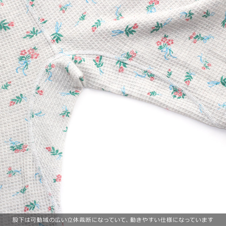 ストレスのない優しい肌触りと保温性に優れたワッフル素材を使用し、締め付けのないゆとりあるシルエットが特徴。