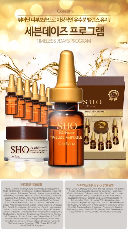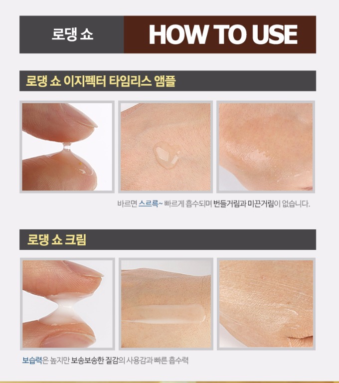 Premium 28 Days Ampoule Distribute an adequate amount at 2~3 times to evenly spread on the face and neck to be fully absorbed. Rodin SHO Cream Apply an adequate amount all over the face and tap to be well absorbed. |