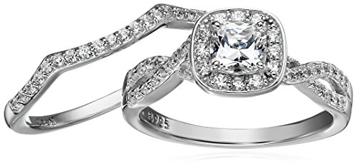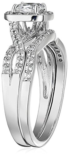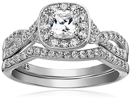 -. Feature : Sterling silver bridal set featuring ring with haloed cushion-cut Swarovski Zirconia center stone and sparkling crisscross shoulders on band / Coordinating band features round Swarovski zirconia stones set along top curve / Imported