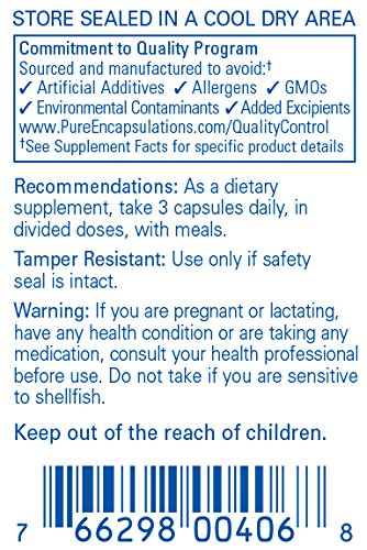 FREE FROM: Pure Encapsulations products are free from wheat, gluten, egg, peanuts, magnesium stearate, hydrogenated fat, artificial sweeteners and colors, and other unnecessary excipients. Any product containing ingredients derived from allergens, such as soy, dairy or shellfish is clearly labeled. * These statements have not been evaluated by the Food and Drug Administration. This product is not intended to diagnose, treat, cure, or prevent any disease.