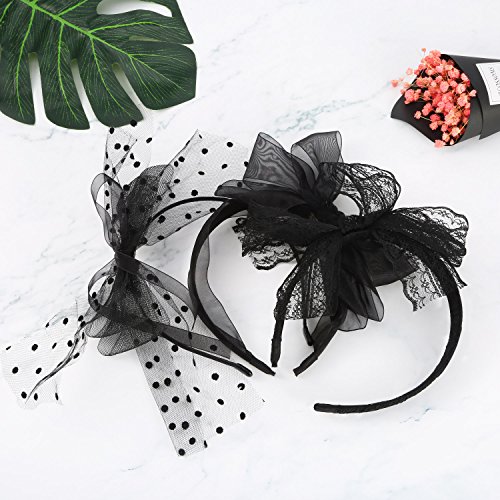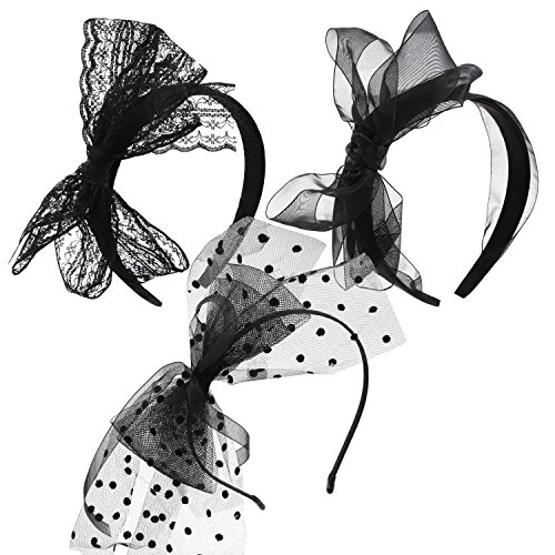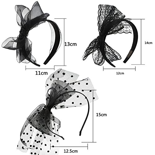 3 Pieces 80's party lace headband with bow 80s costumes accessories for women Lace headband set: Features a black lace headband with a matching black lace bow at the top, one size fits most kids teens and adults; Package includes 3 pieces lace bow headband, meet your dressing needs. Good 80's costumes accessories: These 80's lace bow headband are suitable for a variety of 80's themed costumes, great match to your 80s costumes and complete your 80's themed costume. Specifications: Quantity: 3 pieces Color: black Size: Lace gauze bow: approx. 17 x 8 cm Lace bow: approx. 18 x 13 cm Metal headband's bow: approx. 26 x 9 cm Hair hoop internal: approx. 14 x 12 cm Package includes: 3 x 80's Lace headband 0