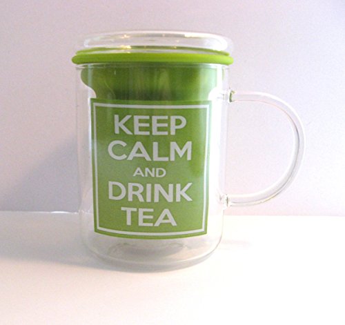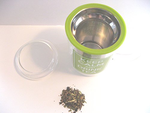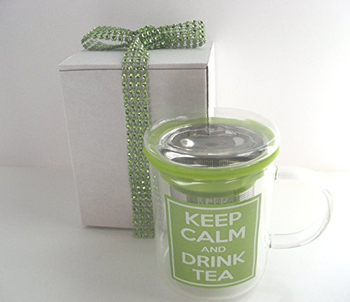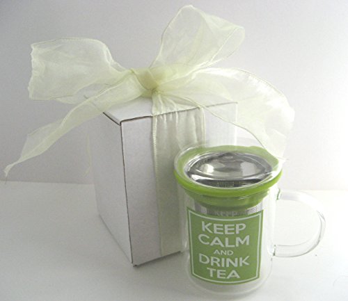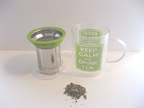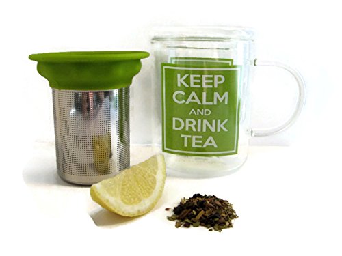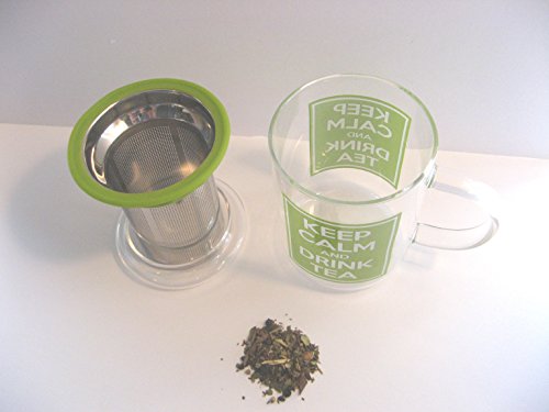 Glass Tea Mug with Stainless Steel Tea Infuser - Loose Leaf Tea Infuser Mug - Tea Strainer - Tea Steeper - "Keep Calm and Drink Tea" Nicely Gift Boxed - Great Tea Steeping System