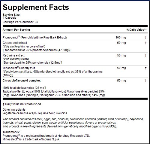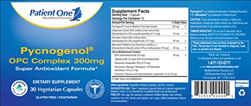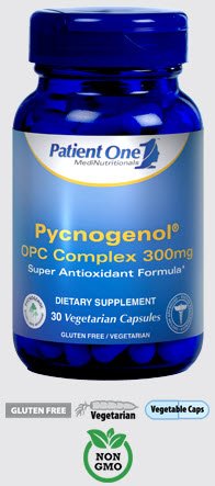 Patient One Pycnogenol® OPC Complex 300mg is a potent super antioxidant formula comprised of multiple OPC's (Oligomeric Proanthocyanidins)- powerful bioflavonoids that act as free radical scavengers in the human body and promote antioxidant activity and overall healthy aging. This highly absorbable formula features a network of clinically proven antioxidant compounds with a diverse spectrum of demonstrated health and wellness support functions: promoting heart health, normalizing blood vessel diameter, protecting retinal capillaries, promoting clear respiration, encouraging healthy inflammatory response, supporting youthful and healthy skin, and more. NOTE: Looking for Physiologics Pycnogenol 100mg 60 Caps? Please note that this product has been discontinued, and that Patient One - Pycnogenol OPC Complex 300mg (30s) has replaced it.Feature
