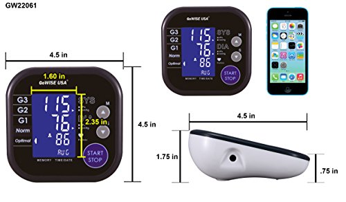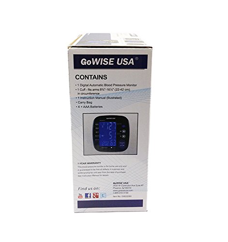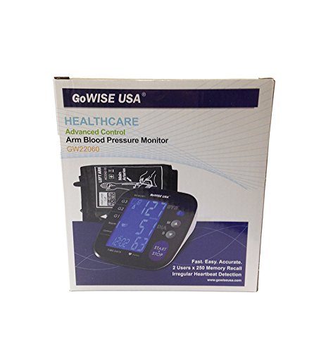 -. Brand : GoWISE USA -. Feature : Systolic blood pressure; Diastolic blood pressure; Pulse rate; Irregular Heartbeat Detection and Hypertension Risk Indicator; Measurement appears during inflation / The monitor is powered by 4 AAA batteries that are included with each purchase. An option to power with a DC adaptor (not included) is available. / Our blood pressure monitor comes with a large size cuff that measures a range of 8.75"-16.5". / The blood pressure monitor contains a Large LCD Display. It can also store two distinct users and memory records. / Each unit comes with a monitor, cuff, and batteries. -. Label : GoWISE USA -. Manufacturer : GoWISE USA -. MPN : GW22060 / GW22061 -. PackageQuantity : 1 -. PartNumber : GW22060 / GW22061 -. ProductGroup : Health and Beauty -. ProductTypeName : PERSONAL_CARE_APPLIANCE -. Publisher : GoWISE USA -. Studio : GoWISE USA -. Title : GoWISE USA Advanced Control Digital Blood Pressure Monitor w/ Large LCD Display & Large Size Cuff- Upper Arm