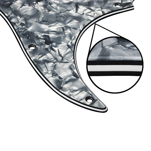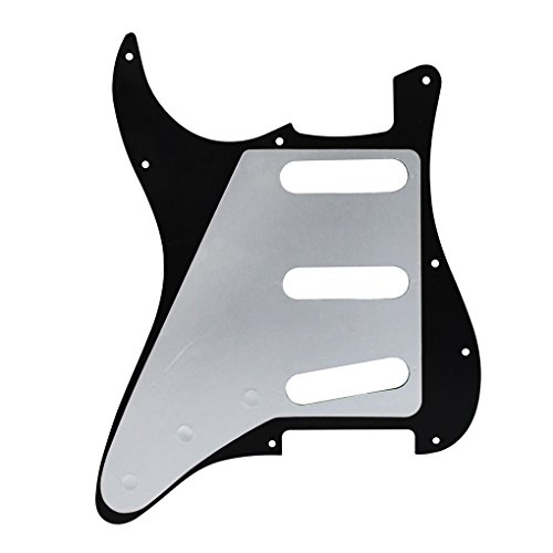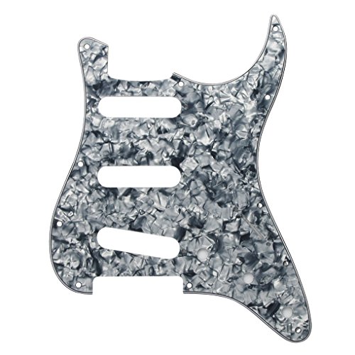 Product Description Feature: * For US Modern Fender Strat Stratocaster style guitar or similar.* With pure aluminum foil shield on the backside, not the common aluminum-foil paper on the market, better shielding property and anti-interference.* All materials are environmentally friendly, thermostability, no smell. Multi-layer plates are pressed under high temperature and pressures, to make them close integration between each layer, will not appear curly, deformation, or separation of different layers.* Excellent product process ensure the edge of the smooth and structured.Two layers of protective films on the front of pickguards, anti-scratch to protect the guitar.Specification:* Style: SSS(single/single/single coil) style pickguard; 11 screws holes in the side of pickguard.* Material: 4Ply Pearl Plate and PVC* With pure aluminum foil shield.* Color: Grey Pearl/Smoky Blue Pearl* With protective film on the surface, while using please split it off.* Note:Item's color might be different from the picture because of the aberration.Package Includes:1 x guitar pickguard 0