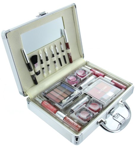 -. Feature : Premium Aluminum Makeup Case / Includes 5 Eyeshadows,2 Blushes, 4 Lip Glosses, 2 Lipsticks / 4 Lip Gloss Pots, 1 Eye pencil. 1 Lip pencil, 6 Applicators and Mirror / Durable Case and premium makeup / Great for Gift