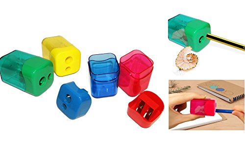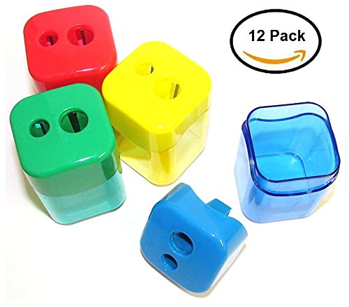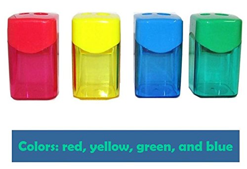 Set Of 12 Double Hole Pencil Sharpeners Square Shaped With Cover and Receptacle! Red, Blue, Yellow, & Green Colors. By Mega Stationers