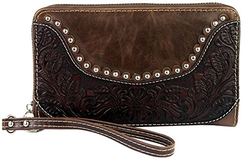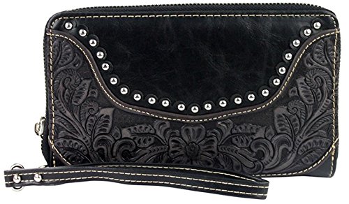 -. Binding : Apparel -. Brand : Montana West -. Department : womens -. Feature : MSRP $39.99 Measures approx. 7.5"W x 4.5"H x 1"D / Tooled leather exterior with zipper pocket on back / Zip around access opens accordion style. 2 compartments, 2 cash/coupon pockets, 8 cc slots / Removable wristlet strap included / See below for full product description -. ProductGroup : Apparel -. ProductTypeName : ACCESSORY -. Size : One Size -. Title : Montana West Tooled Leather Clutch Wallet with Wristlet Strap CC Organizer