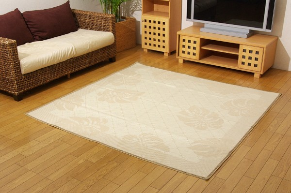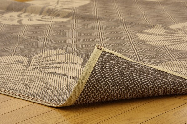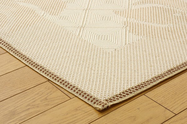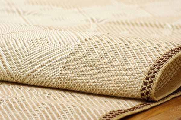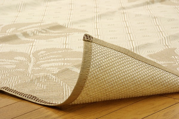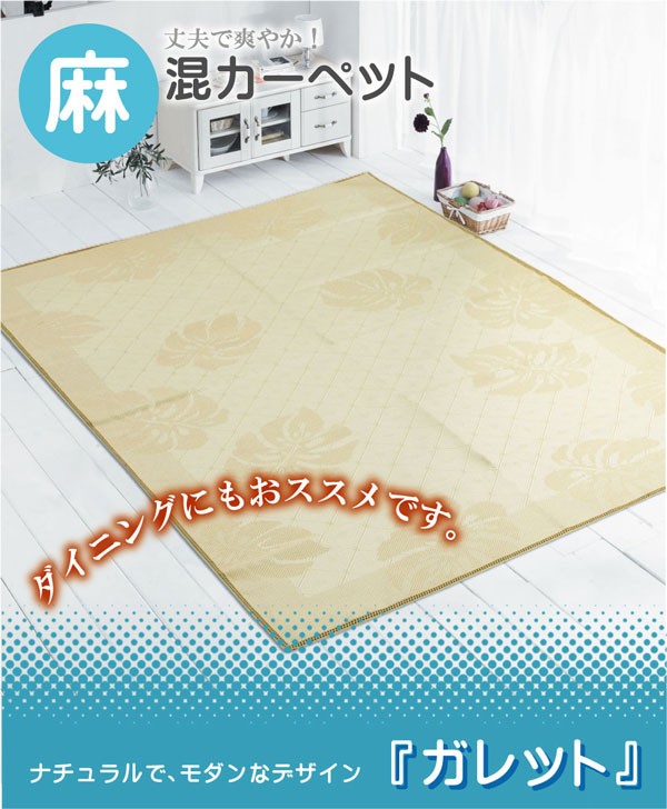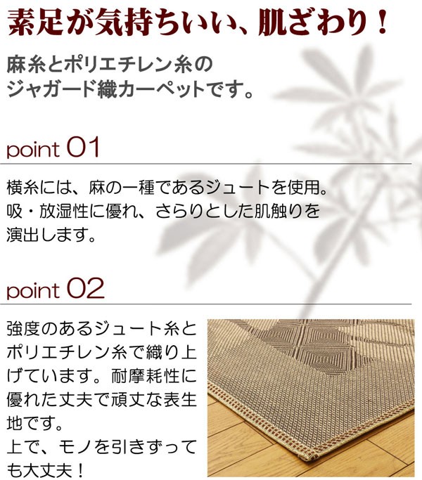 麻糸とポリエチレン糸のジャガード織りのカーペットです。横糸には麻糸を使用しています。熱伝導率に優れ、通気性が良く、夏ものの衣料や寝装具などに用いられることの多い素材です。また適度な光沢があり、強度に優れているのが特徴です。