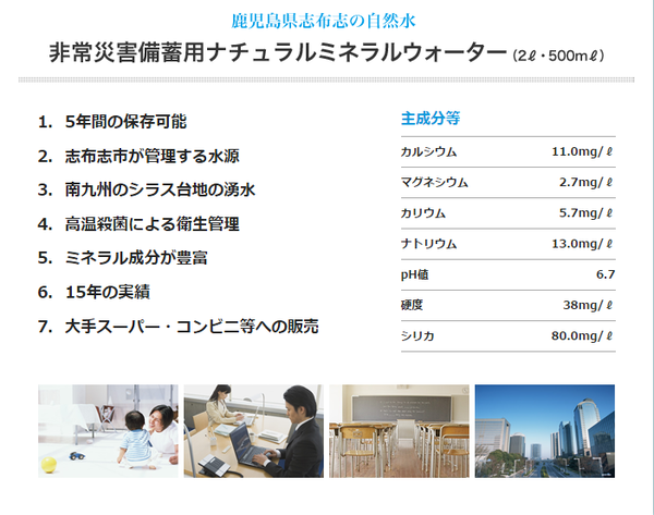 南九州地方特有の広大なシラス台地で長年に渡り自然ろ過された清浄で美味しい湧水を加熱殺菌し、高性能な機械設備によりボトルに充填した大変安全なナチュラルミネラルウォーターです。