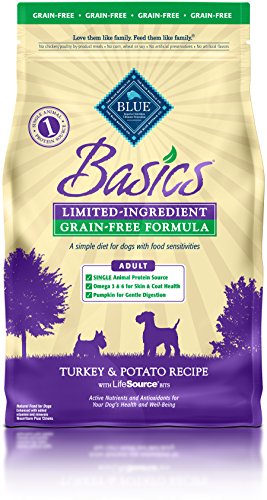 -. Binding : Misc. -. Brand : Blue Buffalo -. Feature : Made in the USA / For adultdogs / Grain Free / Turkey is the first ingredient / Potatoes and peasprovide high quality protein -. Label : Blue Buffalo Company -. Manufacturer : Blue Buffalo Company -. Model : BLU10000-P -. MPN : BLU10000-P -. NumberOfItems : 1 -. PackageQuantity : 1 -. PartNumber : BLU10000-P -. ProductGroup : Pet Products -. ProductTypeName : PET_SUPPLIES -. Publisher : Blue Buffalo Company -. Studio : Blue Buffalo Company -. Title : Blue Buffalo Basics Limited-Ingredient Dry Adult Dog Food