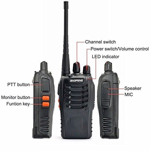 Walkie Talkie Model: Baofeng BF-888S;16 channel; Each radio has a earpiece and a rechargeable Li-ion battery.