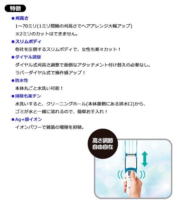 ラバーダイヤル採用で滑りにくくなって操作性が向上。片手で簡単に調節できます。刈り高さはアタッチメント装着で1~70mmまで1mm単位で調節可能。ヘアーキャッチケープもついてます。充電・交流式ヘアカッターです。 |