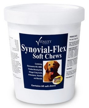 -. Binding : Misc. -. Brand : Vitality -. Feature : Synovial-Flex Soft Chews for dogs is recommended to support healthy joint function in dogs. / May help alleviate the pain associated with normal daily exercise and activity. / It's a comprehensive nutritional supplement that combines Glucosamine HCl, Perna Canaliculus, MSM and Omega-3 Fatty Acids, Antioxidants, Vitamins and Minerals in a delicious treat like chew. -. Label : Vitality Systems -. Manufacturer : Vitality Systems -. MPN : FNGL60 -. PackageQuantity : 1 -. PartNumber : FNGL60 -. ProductGroup : Pet Products -. ProductTypeName : PET_SUPPLIES -. Publisher : Vitality Systems -. Studio : Vitality Systems -. Title : SynovialFlex Soft Chews (60 COUNT)