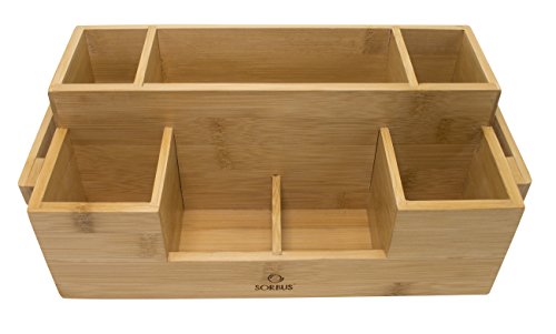 - CLEVER DESIGN — Made from premium quality bamboo wood —Complements most décor — Holds plenty to keep items organized —Includes 7 compartments of various sizes — Accommodates standard size napkins and utensils—Measures approximately 11”L x 6”W x 4.50”H
