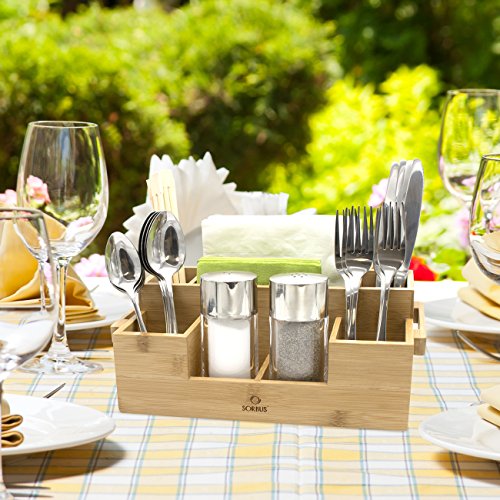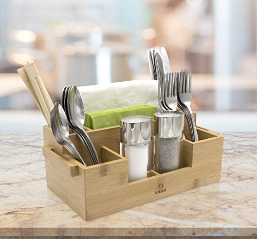 - BAMBOO UTENSIL CADDY — Serve and display flatware, napkins, and condiments, with a built-in seven compartment organizer