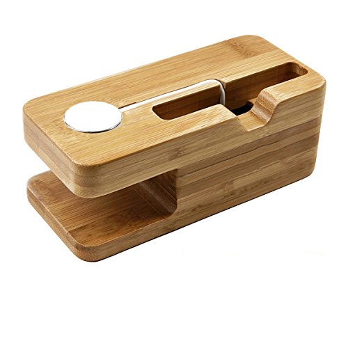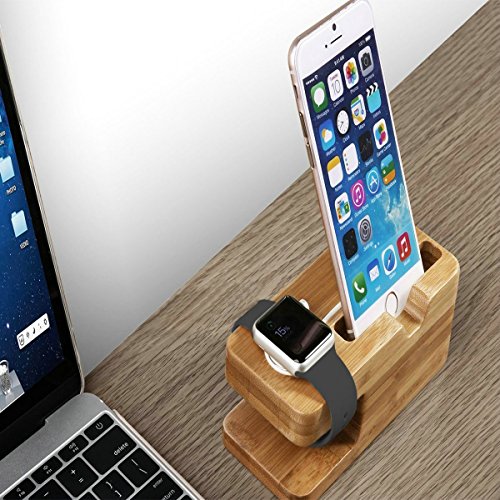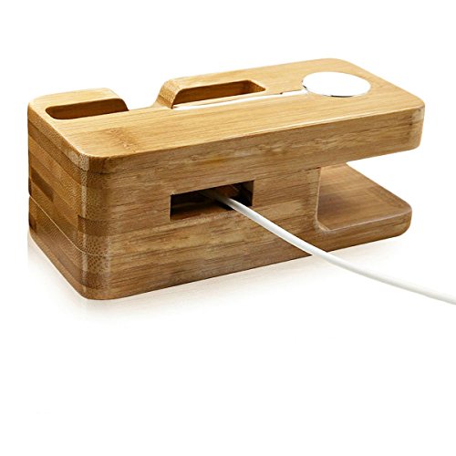 Wood Stand For iWatch and iPhone, Bamboo Wood Charge Dock Holder for iWatch & Docking Station Cradle Bracket for iPod iPhone iPad & Other Phones Tablets,With Cable Ties