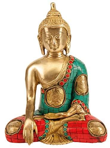 Sitting Buddha Statue, Brass Metal- Coral Turquoise Gemstone Work- Meditating Ashtmangal Decorative Buddha Sculpture