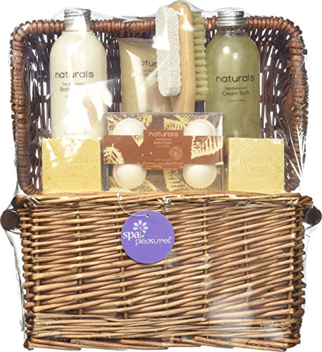 Every essential for a decadent at-home spa day is packed in this lovely lidded wicker basket! The rich, spicy scent of sandalwood adds natural appeal to moisturizing salon quality lotions, scrubs and bath crystals, all expressly collected for your ultimate delight. Set includes: 9.1 fl. oz. body lotion and cream bath, 5.0 fl. oz. body scrub, 2 bar soaps, 4 fizzers, wooden pumice nail brush, and willow basket. Weight 2.8 lbs. Set: 11 1/2" x 6 1/2" x 8" high when closed. Set.Feature