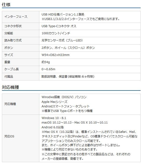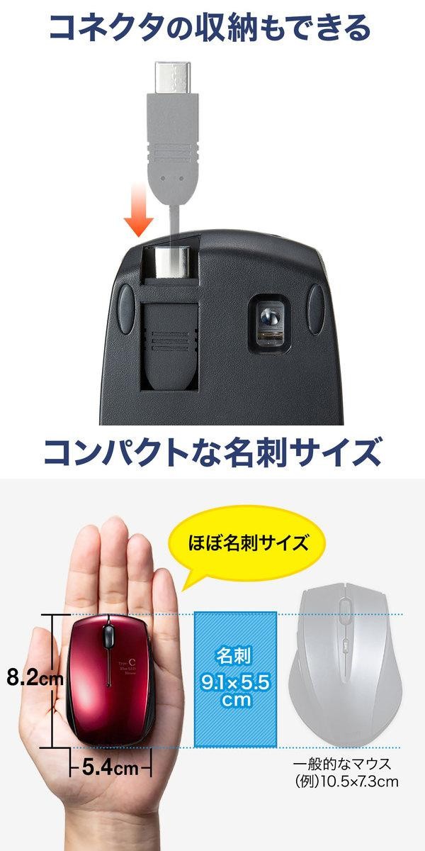 USB Type-Cコネクタを搭載したパソコンやタブレットで使用できる、ケーブル巻き取り式ブルーLEDマウスです。ケーブルを巻き取ってコネクタまで本体に格納できるので、収納がしやすく、ノートパソコンとの持ち運びに便利です。差し込むだけで使える手間なし簡単接続で、面倒なソフトのインストールが不要です。 |
