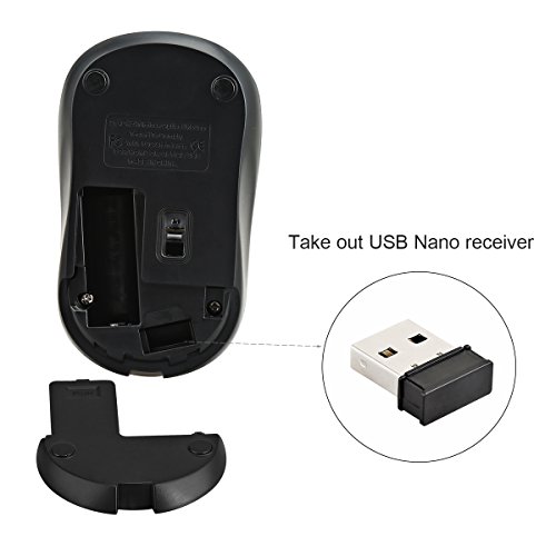 NOTE: The NANO USB receiver is inserted in the back of the mouse.12-month battery life on 1 AA battery (battery NOT included) practically eliminates the need to replace battery. Battery life may vary based on user and computing conditions.