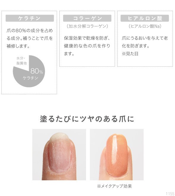 | 素材 | 水、アクリル酸アルキルコポリマー、ベンジルアルコール、PG、加水分 解コラーゲン、ヒアルロン酸Na、テトラヘキシルデカン酸アスコルビル、ケラチン、(エイコサンニ酸/テトラデカンニ酸)ポリグリセリル-10、グリセリン、ヤシ油脂肪酸PEG-7グリセリル、カプリル酸グリセリル、シメチコン、フェノキシエタノール、香料、(+/-)(スチレン/アクリレーツ)コポリマー、アンモニア水、マイカ、合成フルオロフロゴパイト、酸化チタン、青404、赤220、赤226、黄205 |