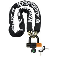 -. Feature : New York Chain with EV Series 4 Disc Lock from Kryptonite / 10mm, 4-sided chain made of triple heat-treated boron manganese steel for ultimate strength / Narrower inner width of individual links prevents leverage attacks / Weatherproof nylon jacket allows compact coiling and protects bike surface / EV series 4-disc lock is 14mm hardened MAX-performance steel shackle with double deadbolt locking mechanism
