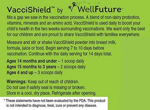 Studio : WellFuture Publisher : WellFuture Binding : Health and Beauty Product Description VacciShield is a nutritional support supplement for infants and children to use during the vaccination process. As an expectant mother Dr. Clinton became concerned about vaccines and wanted an option to support her son during vaccinations. VacciShield was designed from nutritional research to help support healthy brain, immune, gastrointestinal and detoxification function during vaccination. Each ingredient in VacciShield was specifically chosen to boost health in the body systems that come under stress during vaccination while at the same time decreasing inflammation. VacciShield is a blend of non-dairy probiotics, vitamins, minerals and an amino acid designed to support health in the two weeks surrounding vaccinations. This product is not a vaccine alternative nor is it a cure for vaccine side effects. When vaccinating, you want your children to be in the best of health. Many vaccine experts recommend multiple nutritional supplements during vaccination. Millions of people use vitamins and nutritional supplements to boost immunity and overall health in a variety of situations -airplane travel, cold season, high stress times, and any situations that put extra strain on the body's health. Similarly, parents want a way to support their children's health during immunizations. VacciShield is an easy to use supplement that will support your child's health during the time of vaccinations. Made in the USA with no fillers, binders, artificial preservatives, flavorings, colorings or ingredients, VacciShield is dairy and gluten free. VacciShield contains ONLY the ingredients listed on the bottle, there are no hidden ingredients in VacciShield. We source the finest quality nutrients in the most bio-available forms. We've partnered with Vitamin Angels and with each VacciShield purchased we make a matching 1-for-1 nutrient grant to children in need around the world. We wanted only the best for our children and are proud to share with families everywhere. 0