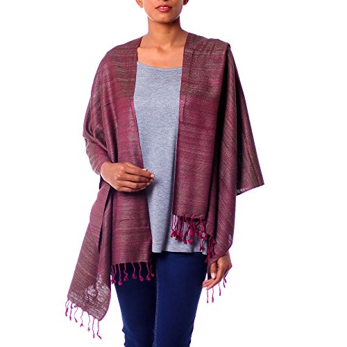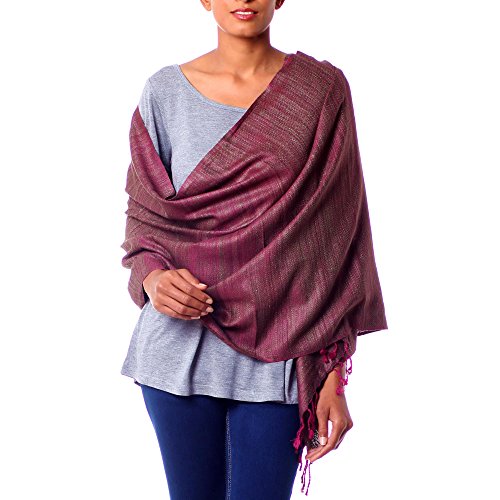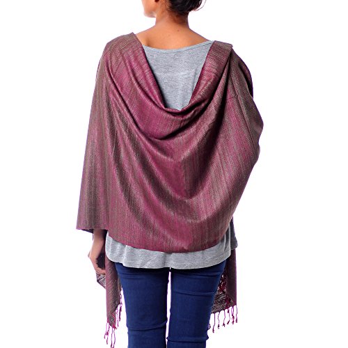 About this item: Khitish combines shimmering strands of silk in a majestic shawl. He uses an olive warp, weaving horizontal strands of bright plum to create the color nuances.
