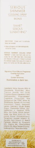 Hampton Sun's Bronze Serious Shimmer Cooling Spray is a beautiful way to revitalize skin and achieve a golden, shimmering glow. This amazing product soothes and hydrates the skin on contact using a luxurious cocktail of natural ingredients. Give yourself an extra splash of shimmer for a special occasion, while lounging poolside or for an everyday refreshing boost. Activate the shimmer's beautiful luster with a quick shake - and watch the gorgeous formula swirl. Hold about an arm's length from the body and the mist lightly over the skin. Soothing aloe vera rejuvenates while chamomile calms and soothes skin's surface. Lightly scented with our signature fragrance, Privet Bloom, our Bronze Shimmer Spray makes it easy to achieve a sexy, subtle sparkle any time! This product looks stunning on all skin tones - especially illuminating fair and tan skin.Feature