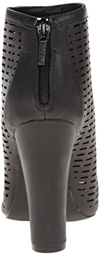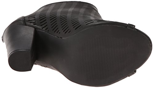 Peep-toe bootie with allover rectangular grid cutouts, solid trims, and covered heel