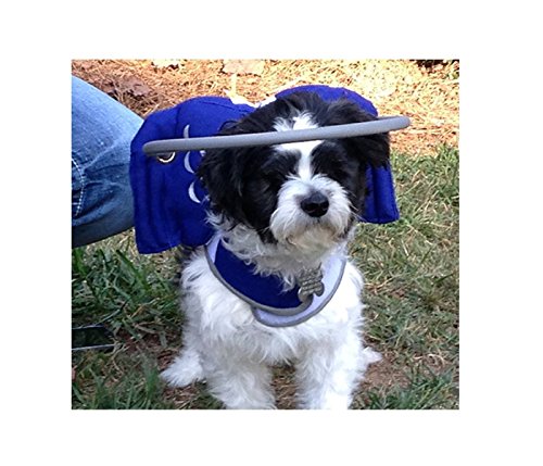Muffin's Halo Blue Angel Wings ® is a 3 piece must-have device that helps blind dogs transition to become familiar with existing or new surroundings quickly. It starts as a harness that is wrapped snuggly around a dog's neck and torso. The wing attaches to the neck of the harness. The halo is attached to the wing and when placed on neck of the harness, the halo is just above the eye level and acts as a buffer to safeguard a blind dog's head, nose, face and shoulders from bumping into hard surfaces. When the halo taps a hard surface, it sends a signal to the dog alerting them to go in a different direction. They catch on very fast and it is truly amazing to watch their confidence level rise. Wearing the harness also makes them feel cuddled and less anxious.Feature