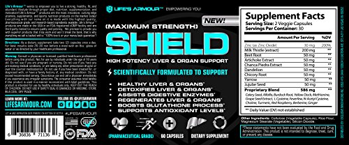 -. Feature : DETOXIFIES LIVER & ORGANS, ENHANCES FAT METABOLISM, ASSISTS DIGESTIVE ENZYMES, BUILDS A STRONG, HEALTHY LIVER AND ORGANS, REGENERATES LIVER AND ORGANS, BOOSTS GLUTATHIONE PROCESS, SUPPORTS ANTIOXIDANT LEVELS: If you're looking for the best liver and organ support supplement available, you've found it! ShieldTM by Life's ArmourTM is the world's best and most advanced liver supplement available, specifically designed to provide the steady delivery of ingredients to help you! / SAFE, EFFECTIVE, TESTED & TRUSTED: All of our products are Third-party tested, and made in the USA in an FDA-registered and cGMP facility. Our supplements are made exclusively with premium pharmaceutical grade ingredients. For men and women looking for a non-habit-forming product that produces results, with no banned substances and can be used in conjunction with a healthy lifestyle and diet. / 100% GUARANTEED RESULTS OR YOUR MONEY BACK - NO RISK! At Life's ArmourTM we stand by our products 100%. Use any of our products for a minimum of 14 days, if you are not 100% completely satisfied just return the unused portion and you will receive a complete refund of your purchase price with no hard feelings and no questions asked, ever! / BUY 2 BOTTLES GET 1 FREE OR 15% OFF ANY SINGLE PRODUCT! : Buy any 2 bottles of Life's ArmourTM products and get 1 free with code "B2G1F" or Get 15% OFF any of Life's ArmourTM products with code "LAVIP15" / LIFE'S ARMOURTM WANTS TO EMPOWER EVERYONE TO LIVE A HEALTHY, FIT, AND ABUNDANT LIFESTYLE! All of Life's ArmourTM products are the most innovative, cutting edge Vitamins, Supplements, and Sports Nutrition products available on the market today, made only with the highest quality and highest potency pharmaceutical grade ingredients. Our brand is synonymous with excellence and is a catalyst for revolutionizing people's lives.