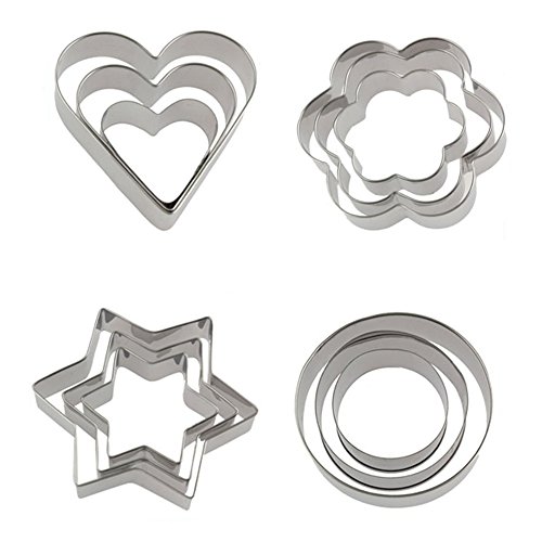 - Set of 12 metal cookie cutter set. 3 pcs star shape, 3 pcs flower shape, 3 pcs circle shape, 3 pcs heart shape.