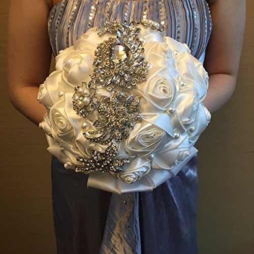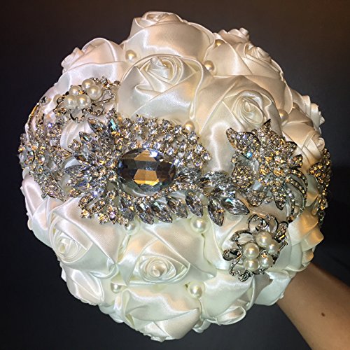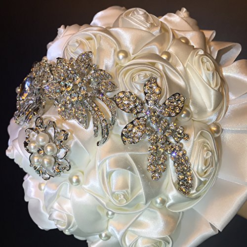 - Feature : about 8 X 11 inches / Materials: satin ribbons, lace, decorative brooches/ pearls, foam top inner base, PVC holder / Designed by M.Ching (Society6.com Artist) / This bouquet has a base of about 3 dozen satin roses. The top is garnished with brooches, pearl and crystal sprays. / PLEASE NOTE: The bouquet you will get is generally the same as on the pictures. Sometimes the designer, M.Ching, would use a similar brooch if a particular brooch is out of stock. She guarantees the general feel of the bouquet would be definitely the same as described. Rest assured most of the brooches are the same but, sometimes, if a particular brooch is out of stock, she will replace it with a similar one. We want to see a happy bride and a happy customer so we make a note here. We wish you a happy wedding day!