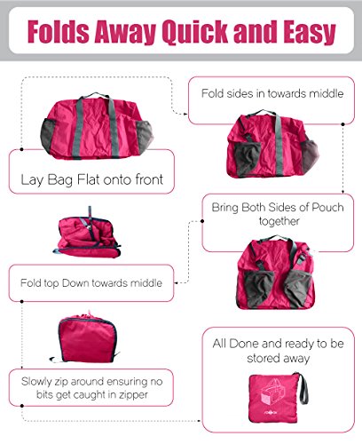 - Feature : Quality and Uniquely Designed Foldable Travel and/or Gym Duffel Bag / Small enough to use as a Carry On Luggage but large enough to hold multiple everyday garments and essentials / Suitable for Women, Men, Teens and big Kids / Made with durable lightweight waterproof Nylon / No Questions asked, Money Back Guarantee if you aren't 100% happy with your purchase