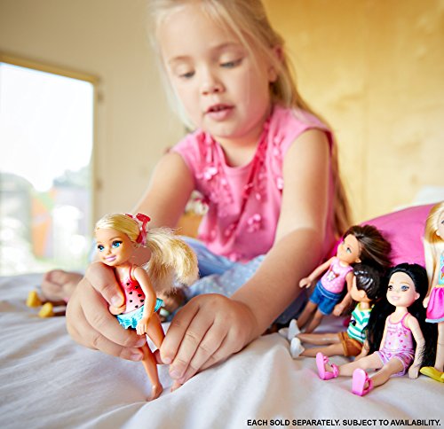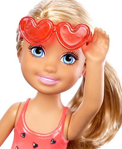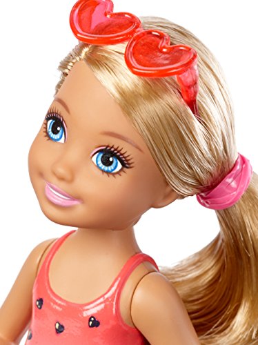 Chelsea doll and her friends can play out so many fun stories! This swimming-themed Chelsea doll comes with a removable skirt, sunglasses and a cardboard juice drink to expand the play possibilities. Fit the refreshing beverage on Chelsea doll’s hand to add realism to your stories. She looks adorable with a watermelon print on her bodice and blue skirted cover-up. Pink heart-shaped sunglasses complete the swimmer’s sunny look. Collect all of the Chelsea dolls and accessories for even more exploration and possibilities (each sold separately, subject to availability). Includes Chelsea doll wearing removable skirt and sunglasses, plus themed accessory. Colors and decorations may vary.Feature