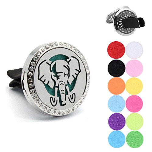 Aromatherapy Essential Oil Diffuser Vent Clip Car Air Freshener/White K Stainless steel/ Hollowed Elephant with Rhinestone/ Round/ Open Magnetic Lock...