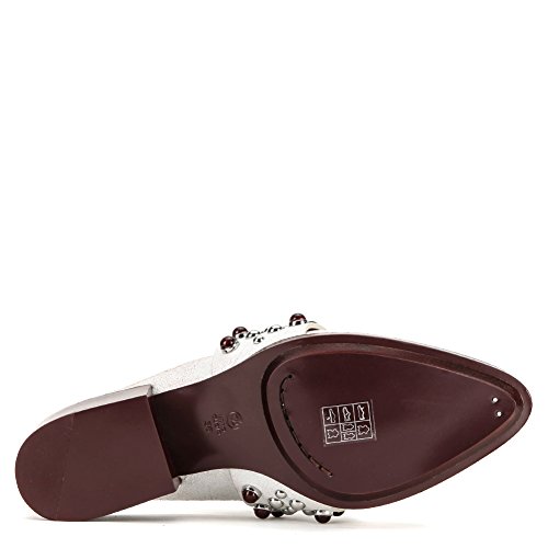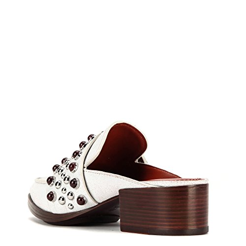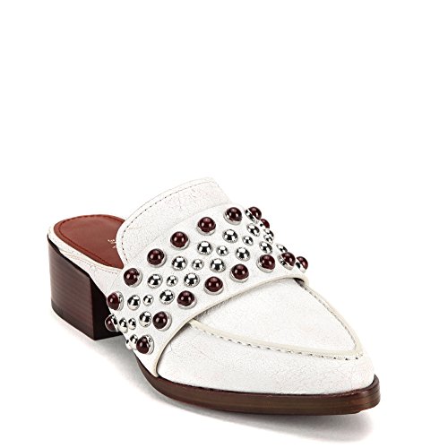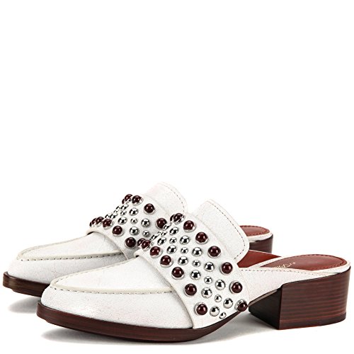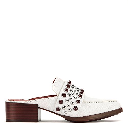 Product DescriptionWhite mule featuring a pointed toe, stacked block heel, embellished silver rivets and maroon studs.0