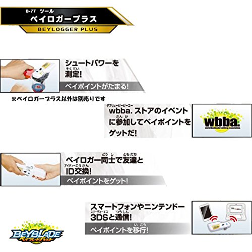 (1) When attaching to the launcher, measure and record shoot power and number automatically. (2) Participate in wbba. 'S events · tournaments, friends' bay logger, communicate with bay logger plus, bay pad of wbba. (3) You can view and manage the data recorded with the free application for smartphone. (4) Data managed by free application can be viewed on Beyblade PC site. (5) You can also view and manage data with "Nintendo 3DS" free application. (6) You can exchange data (synchronize) with smartphone, "Nintendo 3DS" by wireless communication without using earphone jack. ? Response to bay logger plus free application for smartphone is planned around the end of April 2017.