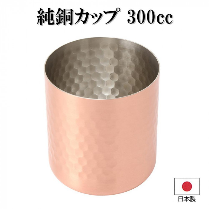 シンプルで槌目模様がかっこいい純銅カップです。 製造国:日本 素材・材質:本体:純銅内面加工:錫メッキ外面加工:クリア塗装(艶消し・槌目模様) 商品サイズ:約73×73×80mm 重量:130g 仕様:容量:300cc食洗機:不可電子レンジ:不可 付属品:取扱説明書 ※サプライヤー直送品 ご注文後3~4営業日後の出荷となります【商品名】純銅カップ 300cc HK-7 0538001