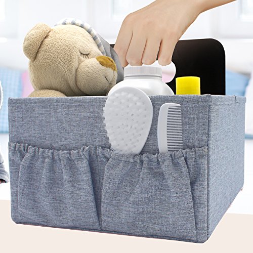 Store all your baby, infant, and kid supplies in this adorable multi-compartment organizer. It's a stylish way to keep diapers, wipes, ointments, and many other essentials handy. You can separate the caddy using the Velcro insert divider to fill both sections with specific products, or you can detach the insert for larger items like blankets and towels. The outside pockets are big enough to hold small creams and grooming tools, but versatile enough for adult personal items. Now parents can keep products within reach at home or on the go. The portable handle makes it easy to carry around the house and folds flat for storage. As your baby grows, this caddy can be used for toys, books, art supplies, or mama's make-up caddy!