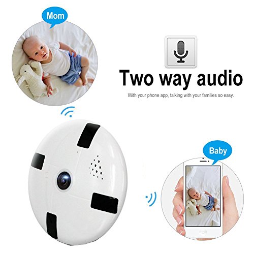 -. Feature : Super wide view angle---360 degree fisheye Wi-Fi IP camera without blind spots. This 360° Wi-Fi camera keeps an eye on every corner in your home/store/office, with Night Vision / Night vision ---The night vision feature makes it easy to see clear video when the condition is dark and the standard video is amazing in the daylight,it is small compact and you are able to integrate it with another wall ornament so it is not noticeable / ADVANTAGES---Pet monitoring, nanny cam, business monitoring, security, vacation home monitoring, senior monitoring, remote live video streaming via Smartphone, download the free APP to view anytime anywhere. / Quick WiFi setup via IOS or Android Smartphone using supplied APP, Remote access to the camera on Smartphone. Loop recording: When the memory full, it will auto cover the oldest video files. / The Mic is very sensitive, and can pick up your voice from a area 40-50 square meter from the camera. you can have a conversation on your phone anywhere in the house using the cameras Mic.So it is widely applied in Home, Store, Office,Warehouse and other fields that need HD live video surveillance