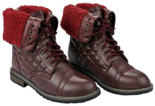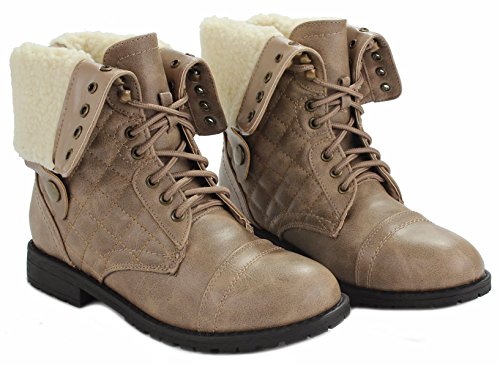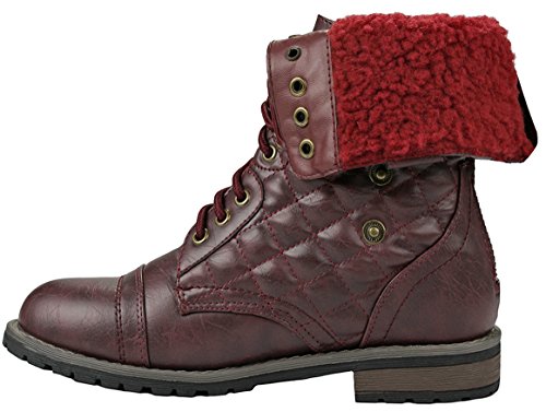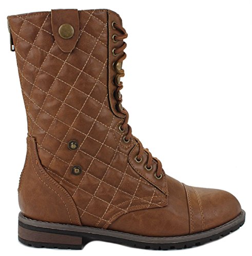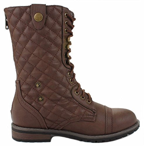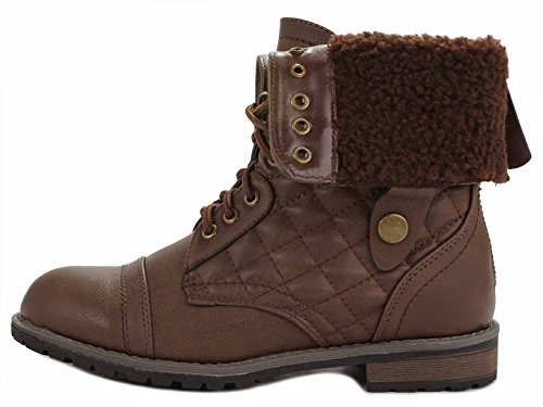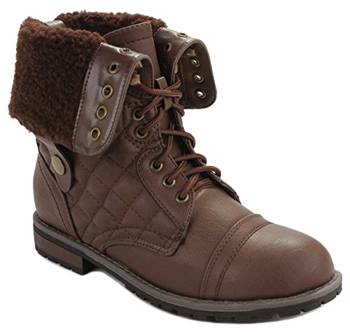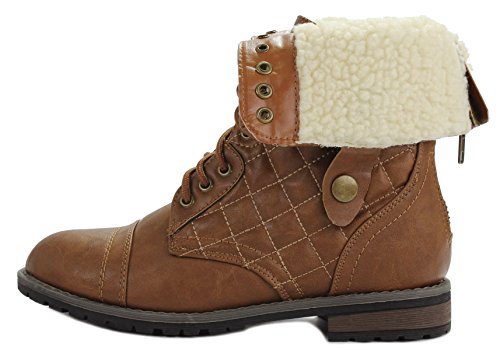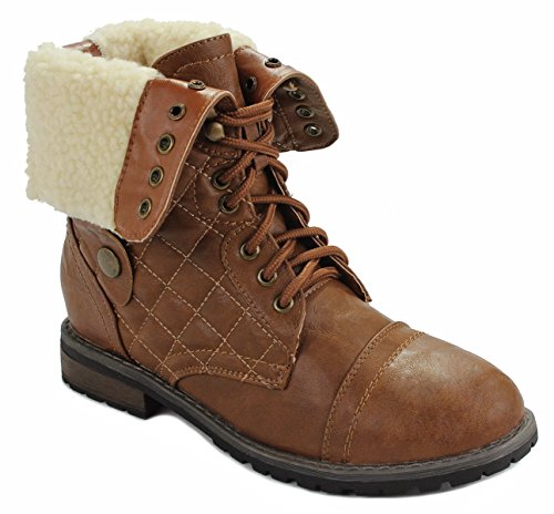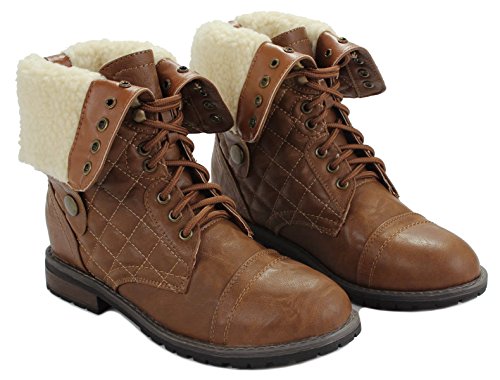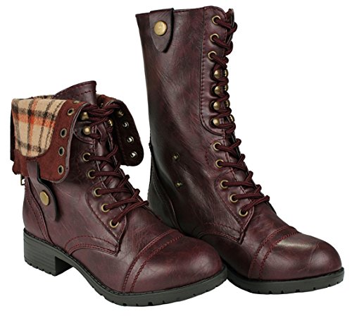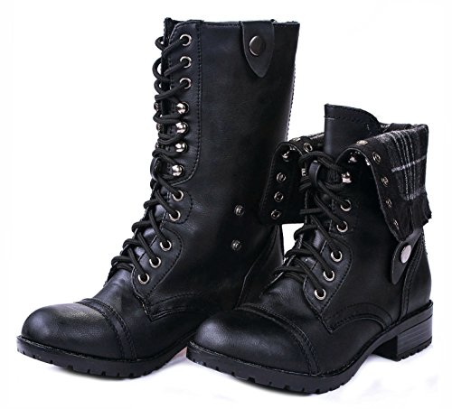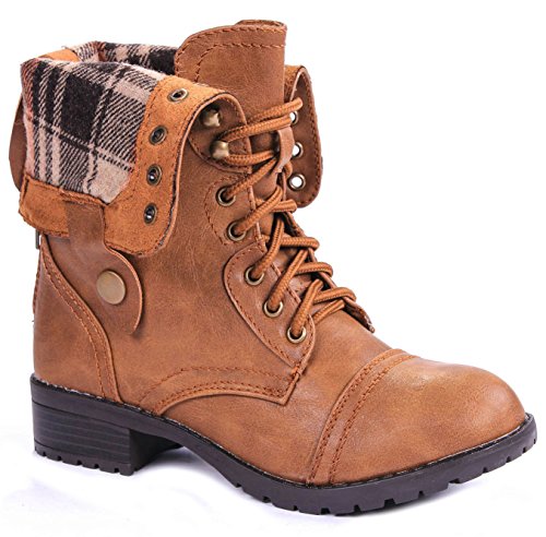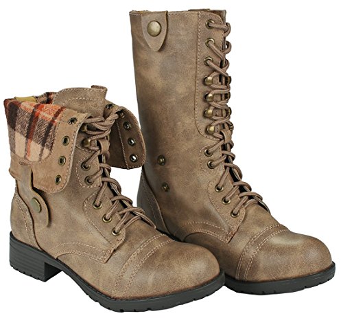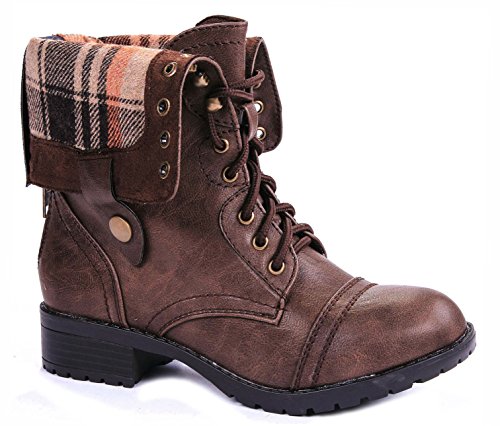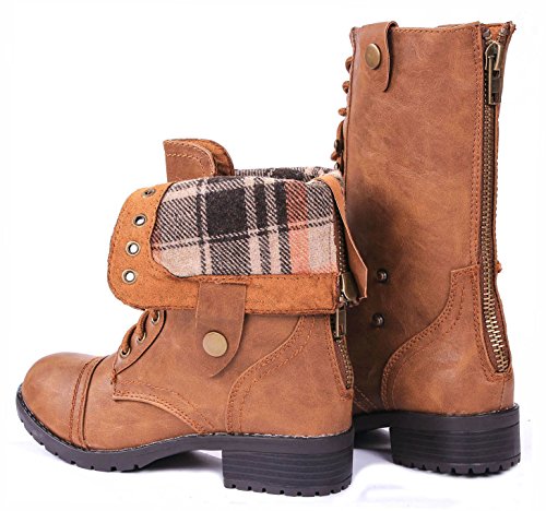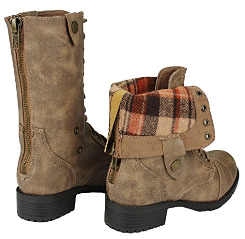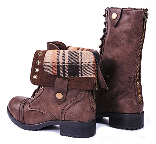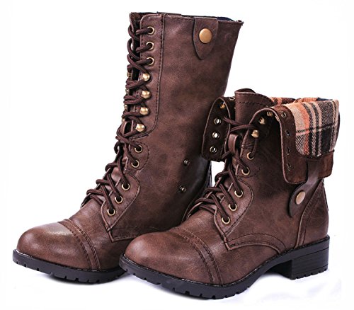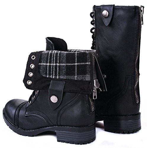 | Women Military Combat Foldable Cuff Faux Leather Plaid/Quilted Back Zipper Lace Up Boots |