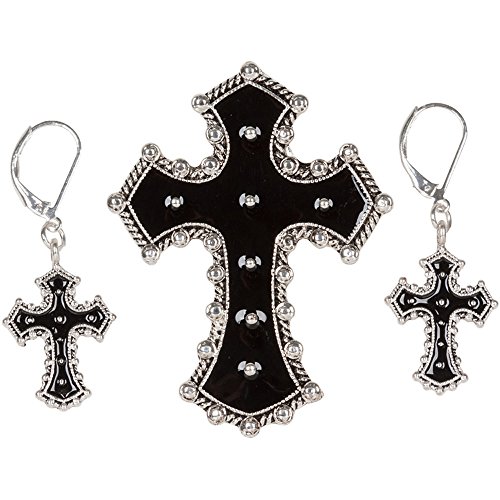-. Binding : Jewelry -. Brand : Heirloom Finds -. Department : womens -. Feature : Brooch measures 2.1" in height and 1.7" in width / Cross Brooch Can Be Worn As a Necklace by Adding a Chain / Coordinating Cross Earrings / Makes a great gift! Arrives gift boxed! -. Label : Heirloom Finds -. Manufacturer : Heirloom Finds -. ProductGroup : Jewelry -. ProductTypeName : FASHIONOTHER -. Publisher : Heirloom Finds -. Studio : Heirloom Finds -. Title : Heirloom Finds Black Enamel Silvertone Goth Cross Brooch Pendant Earring Set