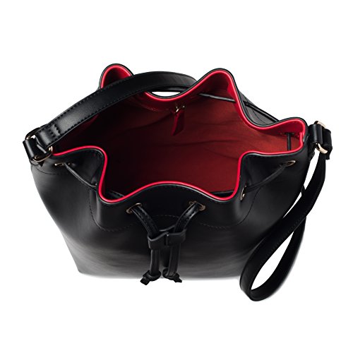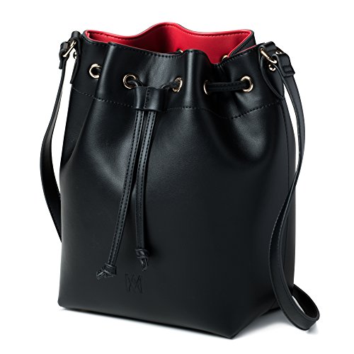 -. Feature : SOFT, SMOOTH, HUMANE, CRUELTY FREE MATERIAL - Our stylish women's vegan handbags are 100% animal cruelty free. The exterior vegan leather is a faux-leather, or "fake", leather material and our interiors are made from a quality, durable polyester. The outer material looks and feels like a quality real leather bag, but is scratch and water resistant, and soft to the touch. / FASHIONABLE, TRENDY AND CONTEMPORARY DESIGNS - Each Marsi Bond bucket bag has been designed for women by FIDM trained fashion designers. Our womans messenger crossbody bucket bag combines on-trend elements with cute, modern, classic, casual, vintage, urban and contemporary designs that are sure to be fashionable for adult, college, teen, teens, young women and fashionable girls alike for seasons to come. / WASHABLE ZIP-OUT LININGS - Every lady's been there - Your make up has broken, that granola bar got loose... A P.R.Ime example of your bag becoming a mess. Girl, Mari Bond has ladies like us covered. All of our female handbags come with washable zip-out linings for exactly this reason. Simply zip our the interior of your bag, throw it in the wash and zip it back in. You're as good as new! / ADJUSTABLE, LIGHTWEIGHT AND FUNCTIONAL - Marsi Bond womens bucket bags are made with durable, waterproof functional materials. The strap is adjustable and easy to use as a crossbody or shoulder bag. The metal rivets and drawstring closure hold all of your belongings safely inside the purse. Great for the woman on the go! / CONTRASTING INTERIOR COLORS - Each Marsi Bond bucket bag has been to set to feature a solid non-P.R.Inted interior color which complements it's dark or light colored exterior. Color combinations include black / red, red / black, brown / pink, pink / purple - maroon and grey-gray / pink. The interior colors can be seen under the simple to use magentic top flap, that can lock the bag closed without the need for a zipper, in both the main body of the bag and the large secret interior pocket.