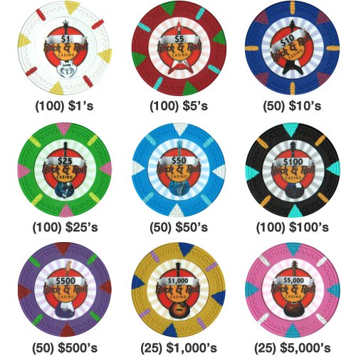 This set includes 100 $1, 100 $5, 50 $10, 100 $25, 50 $50, 100 $100, 50 $500, 25 $1000, 25 $5,000 chips. Two decks of standard playing cards, five dice and a standard dealer button are also included. 0