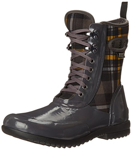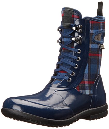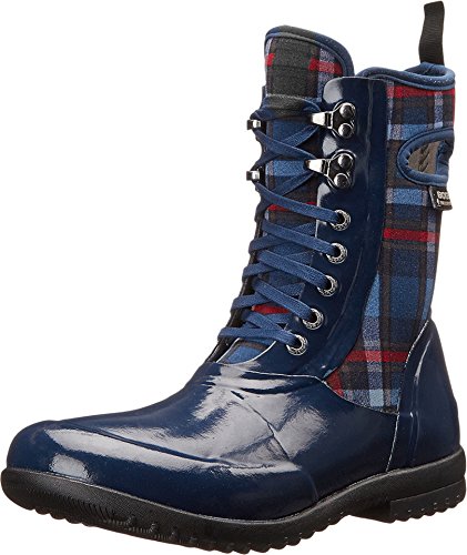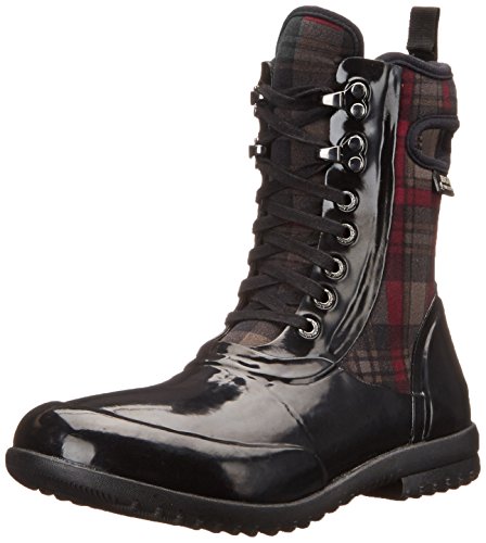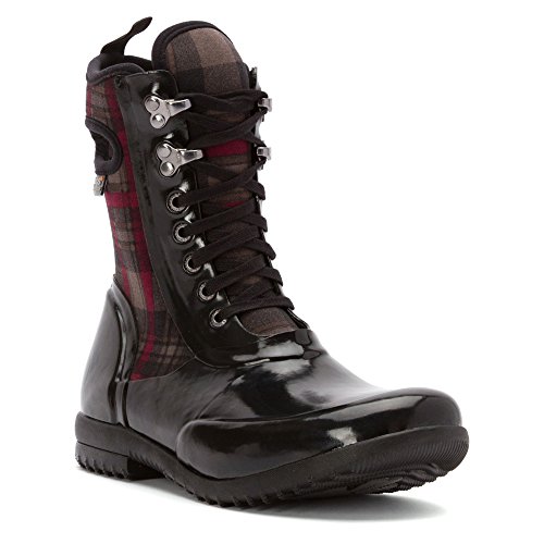 Combat-style rain boot featuring lace-up vamp and plaid insulated back panel